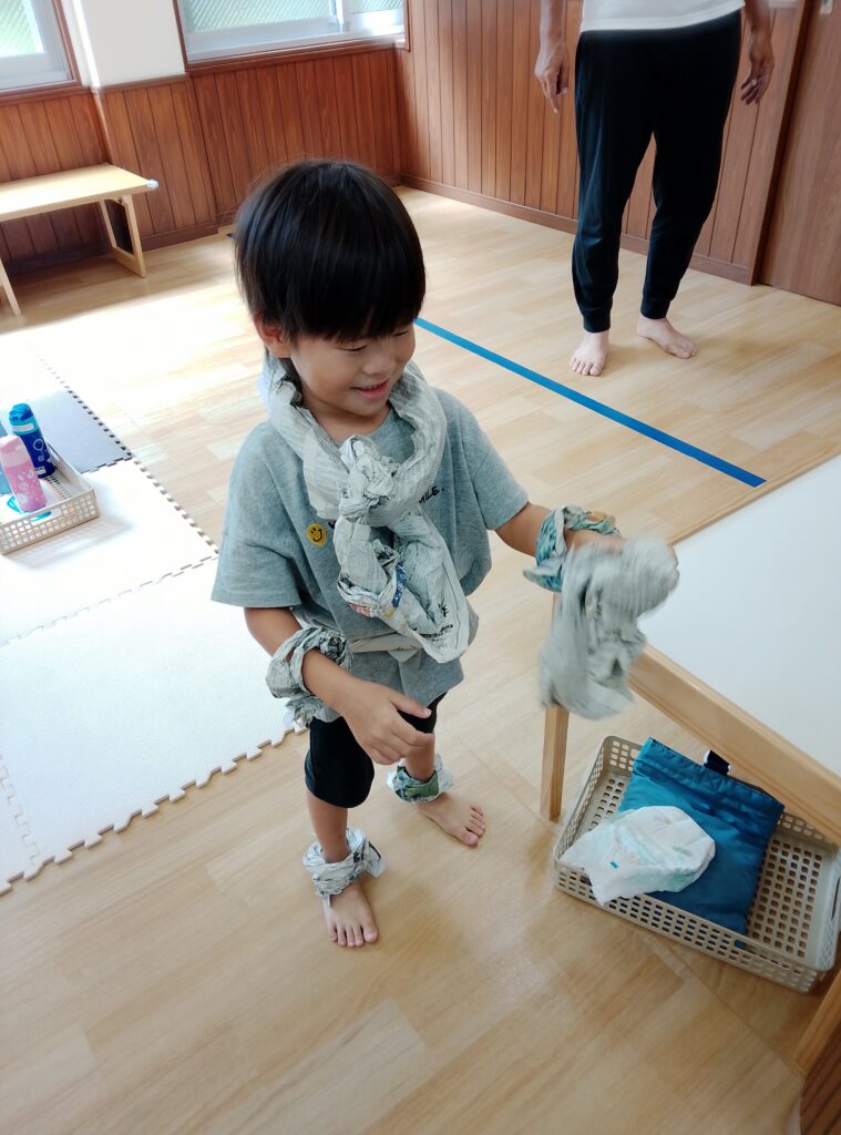 新聞紙をちぎったり、身につけたりして