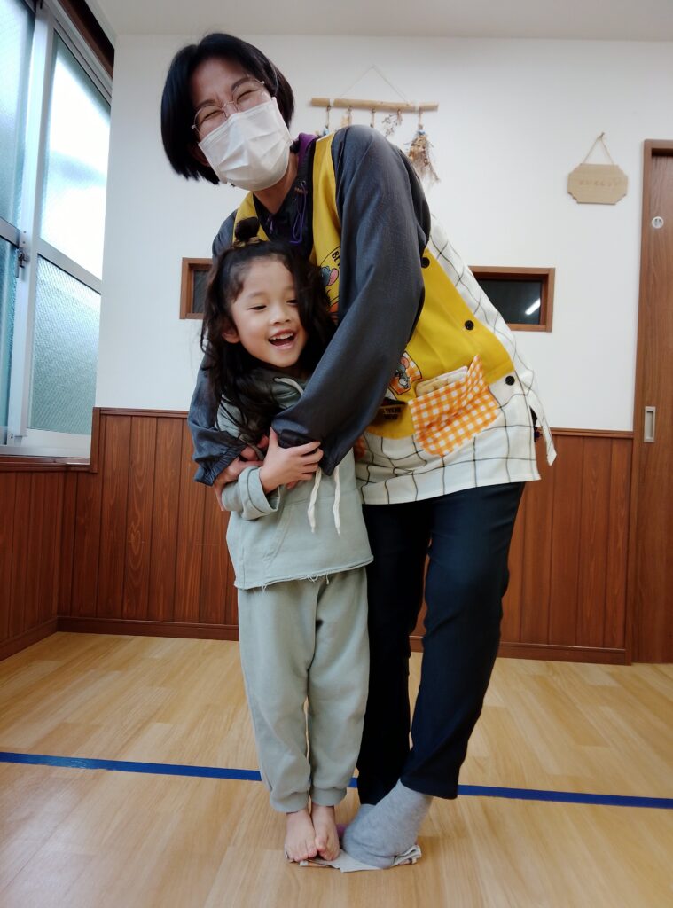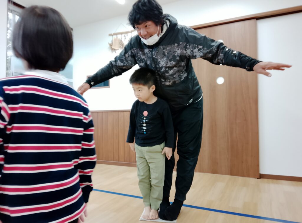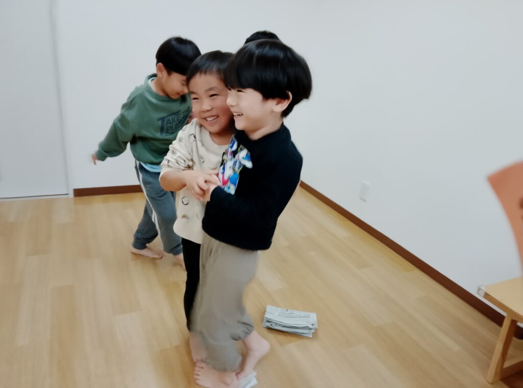 お友達や先生と一つの新聞紙に乗ることで協力することに取り組んだり